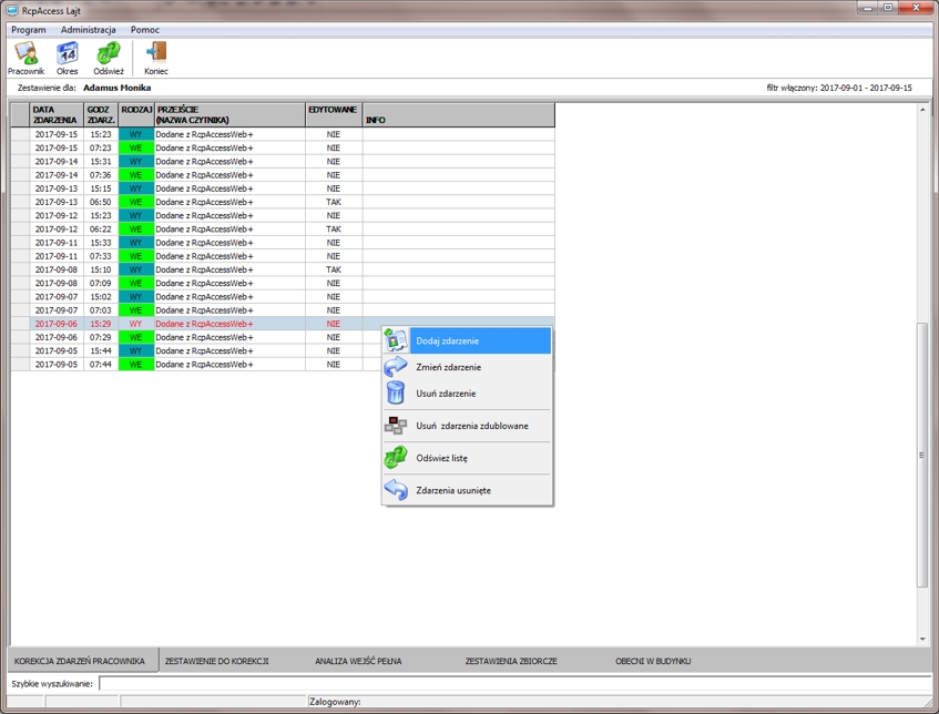 ręczne zdarzeń pochodzących z rejestratorów czasu pracy - korekcję, grupowanie pracowników w działach itd.