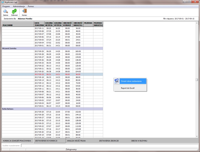 Program RcpAccessLajt da wgląd w wyniki działań pracowników na rejestratorze.