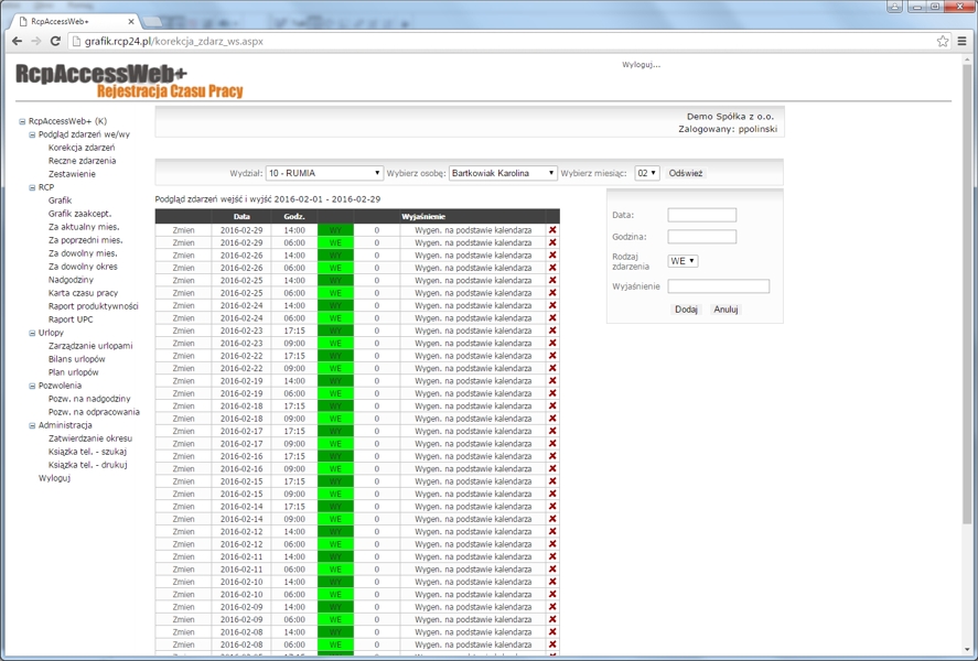 System Rejestracji Czasu Pracy Online, RcpAccessWeb+, umożliwia rozliczanie i prezentację czasu pracy, nadgodzin, urlopów i innych danych,
